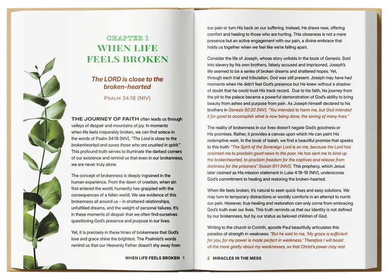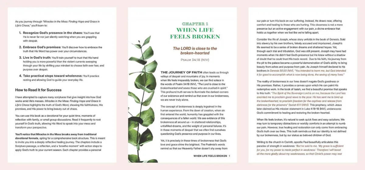 Miracles in the Mess (MIM) is the first book in the series. Written from real-life struggles and biblical truths, it walks with you through the uncertainty, pain, depression, and chaos of life to show you God’s presence and help when nothing makes sense.