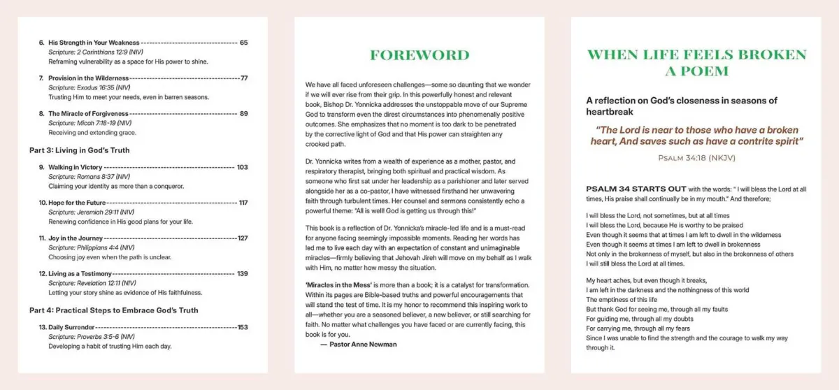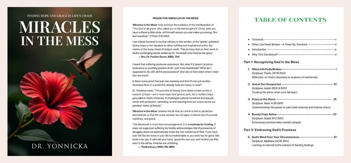 ‘Miracles in the Mess’ truly portrays the evidence of the manifestation of “The God of all grace. I am indeed honored to be that witness to this section of the ‘epistle’ unfolded! Giving hope to the hopeless, it’s rather fulfilling and inspirational within the realms of the many chaos of today’s world. This portrays that on time word of God’s unchanging hands written by Dr. Yonnicka! - Dr. Rev Dr. Pauline Skeen, MBA, Thd.